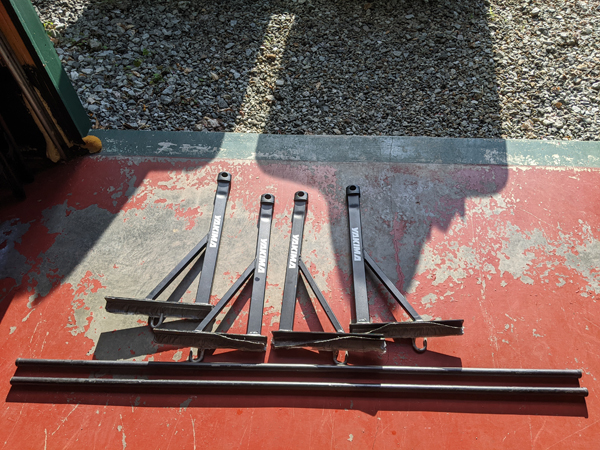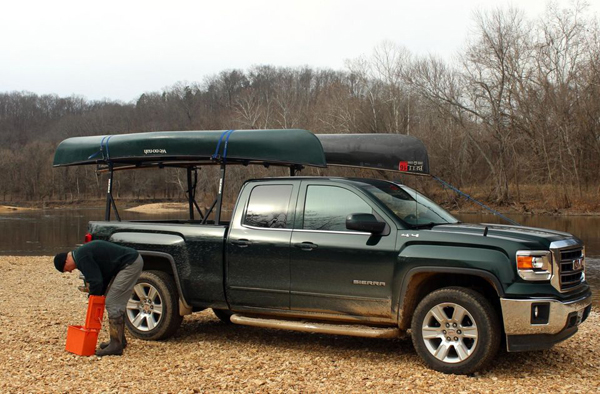 Yakima Outdoorsman 300 truck bed rack for full size trucks. This NO DRILL truck rack is perfect for transporting canoes, kayaks, ladders, or anything else up to 300lbs. I added duct tape where the towers contact the truck bed to minimize any potential scratching. Comes with 78" long bars. One photo is a stock image showing how they are used. Other two photos are the actual items for sale.